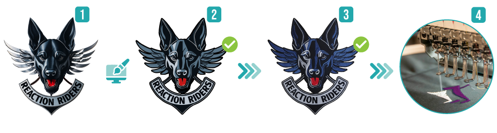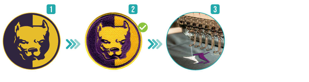 Para pequeñas modificaciones (o si el archivo ya es correcto), nuestro laboratorio interviene directamente, sin costes adicionales. Una vez que subas tu archivo (1) recibirás una muestra fotográfica de tu patch (2) para aprobar antes de proceder con la producción (3).