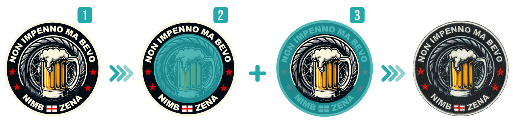 Si quieres conservar el proyecto original (1), la impresión sublimática es la solución ideal: reproduce fielmente tu diseño sin compromisos. El archivo no se modifica y se transfiere exactamente al patch. Puedes elegir la forma - redonda, cuadrada o con contorno - sin convertir el archivo a un formato específico para patch-uri bordados.