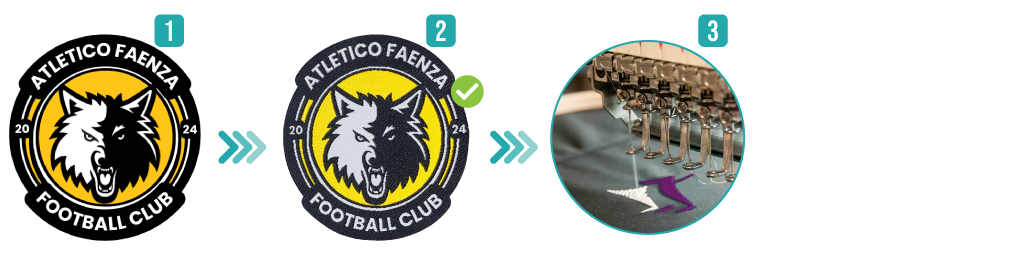 Los archivos gráficos que no requieren intervención se procesan directamente para crear el "modelo", es decir, la reproducción digital de la patch, y pasan directamente al laboratorio para la producción final. Esta es, obviamente, la solución más rápida y mejor que permite recibir una patch fiel al diseño original sin necesidad de ajustes gráficos.